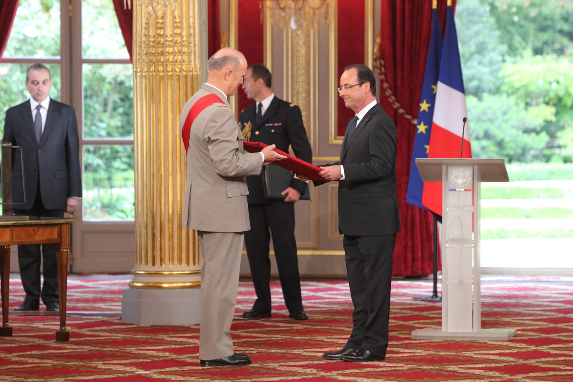 Après un entretien entre les deux présidents, M. François Hollande a raccompagné M. Nicolas Sarkozy sur le perron de l’Élysée. Il s'est ensuite dirigé à l’intérieur du Palais où il a été décoré par le Général Georgelin, grand chancelier de la Légion d’honneur. Le Général lui alors remis les insignes de grand maître de l’ordre national de la Légion d’honneur.