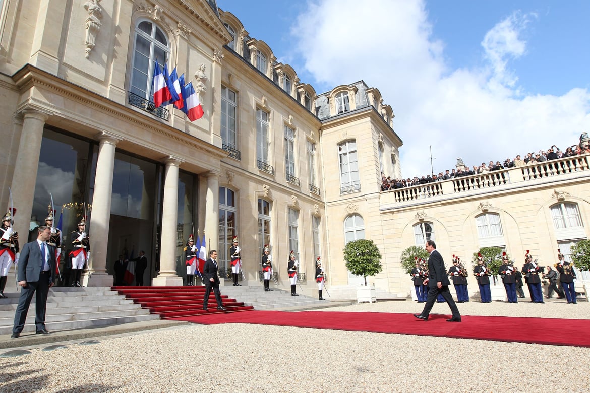 Le mardi 15 mai 2012 à 10h00, M. François Hollande a été accueilli par M. Nicolas Sarkozy au Palais de l’Élysée suite à son élection le 6 mai 2012 en tant que 7ème président de la Vème République.
