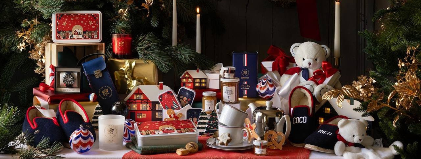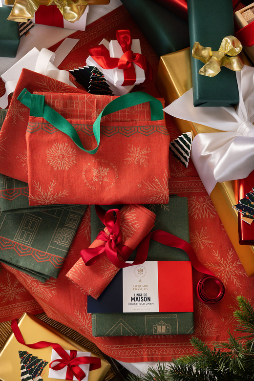 - Le Jacquard Français signe une collection de linge de table pour les célébrations de fin d’année (chemins de table, sets et serviettes) aux motifs rouges et or étoilés, ainsi que des tabliers, essuie-mains et torchons illustrés de scènes de villages d’hiver.