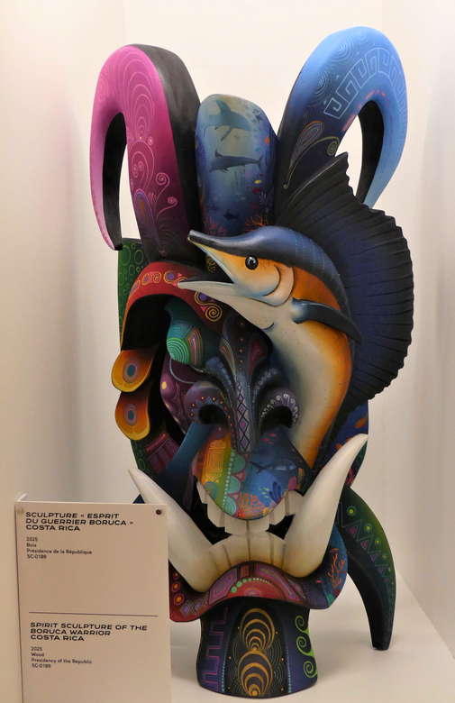 À l’occasion de la conférence des Nations Unies sur l’océan et du sommet Pacifique, le gouvernement du Costa Rica a offert à Monsieur le Président de la République française une sculpture en bois colorée représentant l’esprit du guerrier Boruca. Cette pièce unique, fabriquée artisanalement par les membres de la communauté indigène Boruca, est bien plus qu’un simple objet d’art : elle incarne un symbole ancestral de résistance, d’identité et de connexion avec la nature.