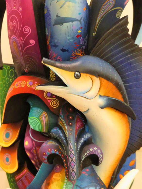L’espadon, présent dans les rivières et sur les côtes du Pacifique costaricien, est un élément clé de cette sculpture. Il représente l’équilibre avec l’environnement naturel, la précision et le respect des espèces sacrées. Cette association entre le guerrier et l’espadon souligne la profonde connexion entre les communautés indigènes et leur environnement, ainsi que leur engagement envers la protection de la biodiversité.